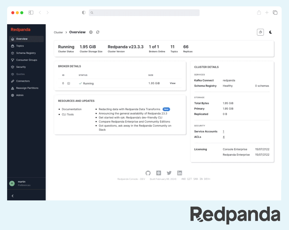 Plataforma de streaming de dados baseada em Kafka de alta performance, latência baixa e confiabilidade, processando eventos em tempo real com armazenamento distribuído.